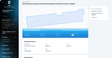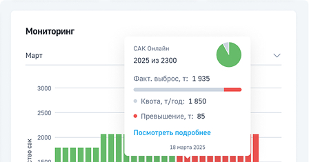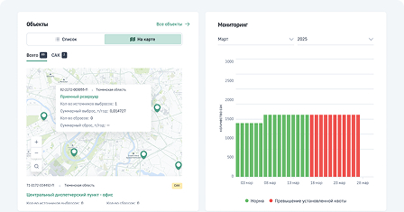 Панель мониторинга, отображает ключевые показатели: выбросы, динамику платежей за НВОС, статус выполнения природоохранных мероприятий